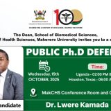 The Dean, School of Biomedical Sciences, College of Health Sciences, Makerere University (MakCHS), invites you to the Public Ph.D. Defense of Dr. Lwere Kamada.